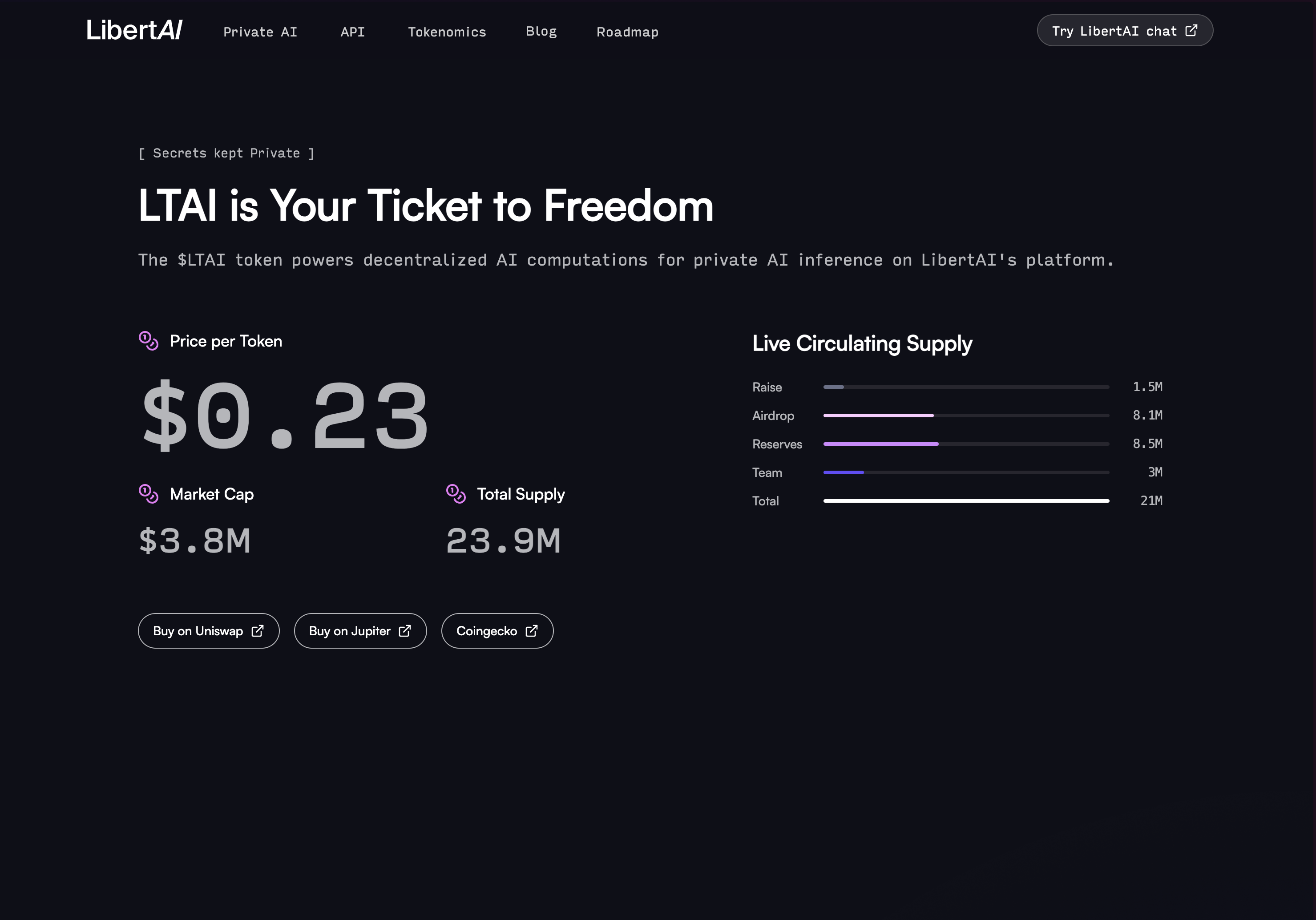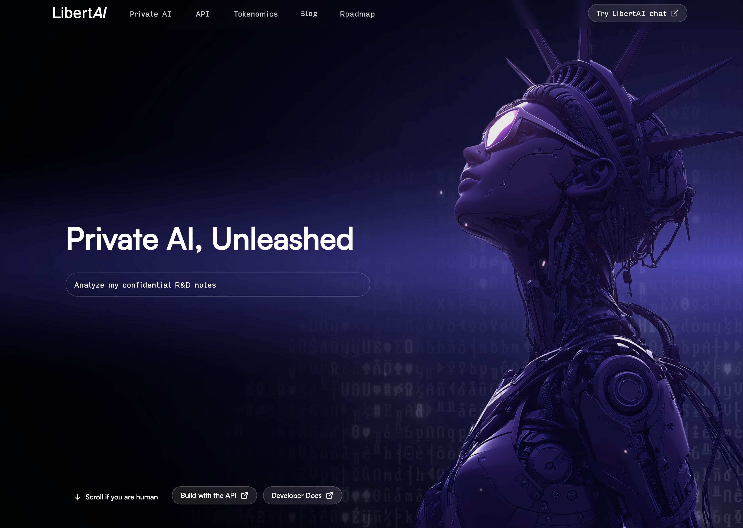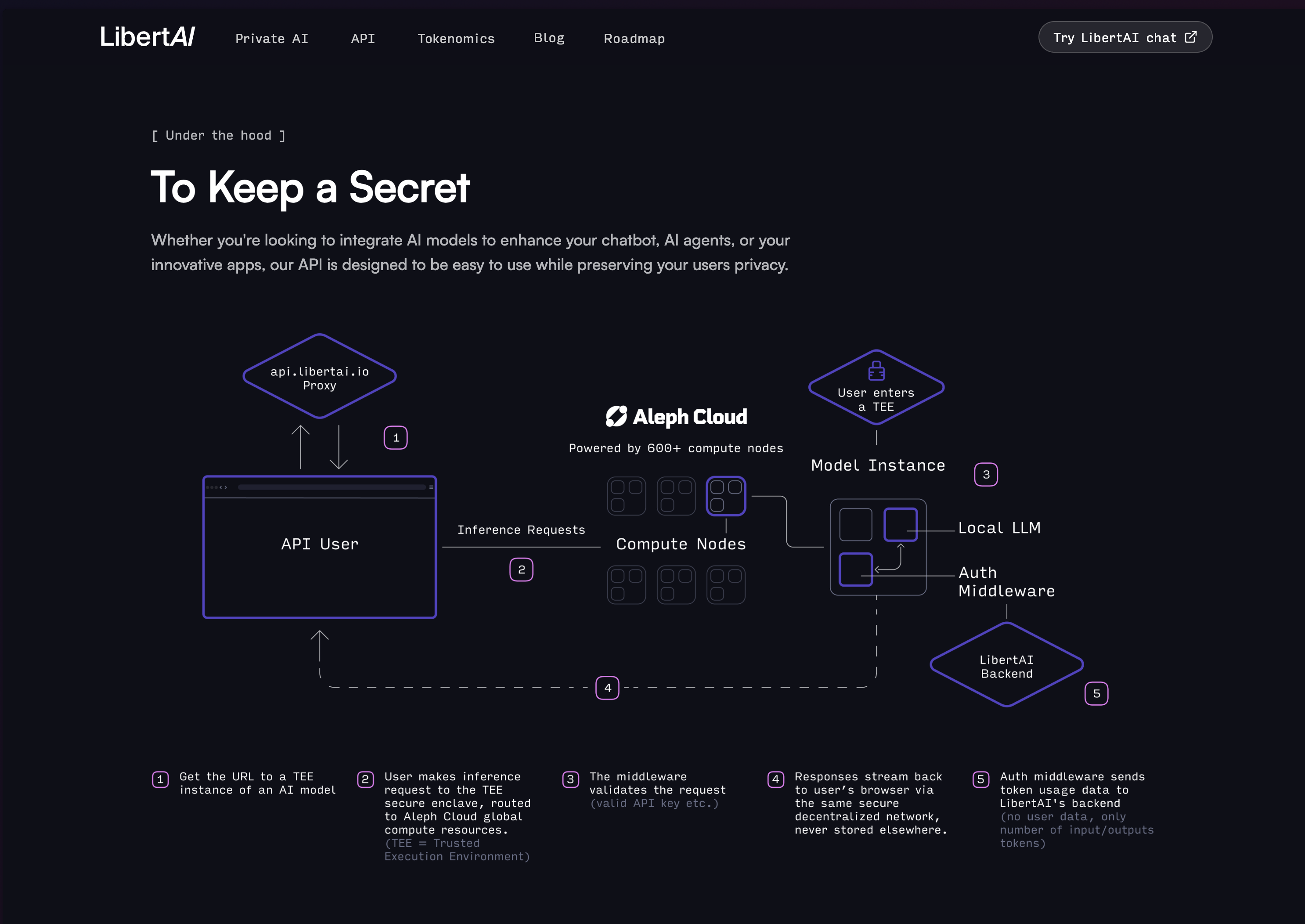 LibertAI is a confidential AI platform providing various AI services (chat UI, inference APIs, AI Agents deployment...) in a confidential way, leveraging TEEs (Trusted Execution Environments) and decentralized technologies.